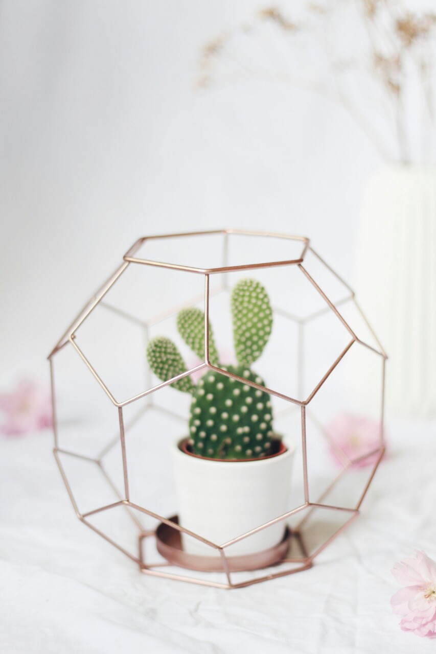 Naast het leuke witte vaasje heb ik bij de Xenos ook deze bizar mooie geometrische theelichthouder gekocht. Ik vind het trouwens wel grappig dat alle grote ketens de trends die er in de interieurwereld rondgaan zó ongelofelijk snel en feilloos oppakken. Ik bedoel: de winkels liggen plots vól met items in koperkleuren en geometrische vormen (verder klaag ik niet hoor, ik vind het helemaal geweldig, haha). Anyway: Ik heb het theelichtje vervangen door een cactus (maar dat had je natuurlijk al gezien), want ik zou Laura niet zijn als ik in een interieur-gerelateerd-artikel geen cactus zou verwerken.